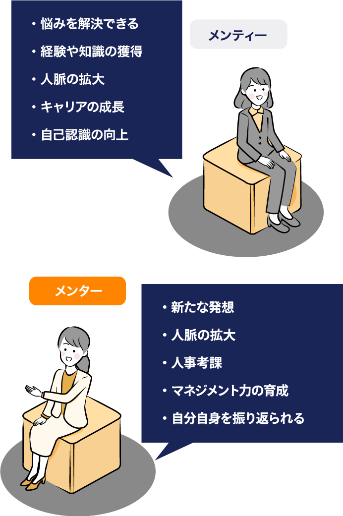 《メンターシップ制度》とは先輩(メンター)と後輩(メンティー)が「二人三脚」で課題に気付き、一緒に悩みを解決する制度です。自由な対話を通じてお互い学び、共に成長することができます。
